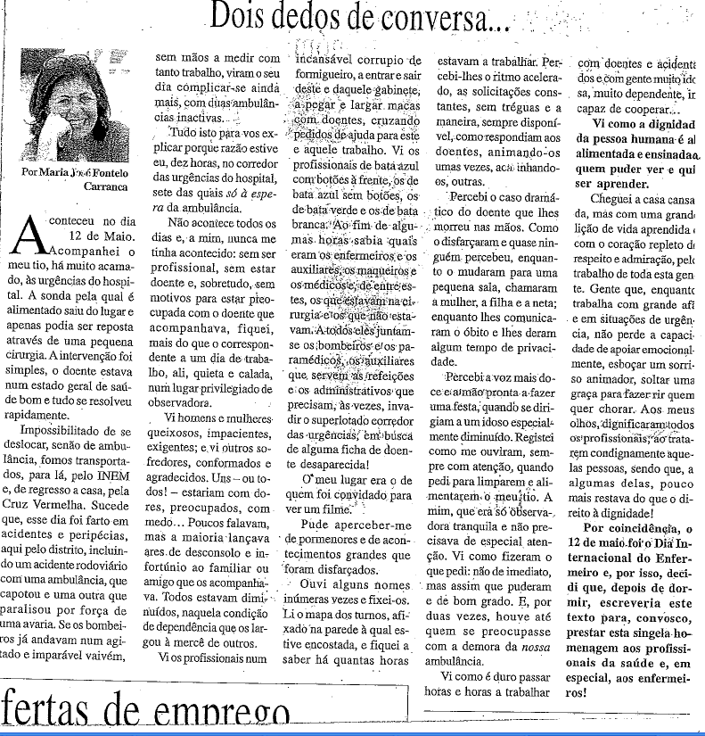 Passados vários anos, durante a preparação de uma palestra, a médica precisava saber o que é que afinal naquela terça-feira, tinha dito de tão importante ao Nelinho, ao ponto de lhe mudar a vida.